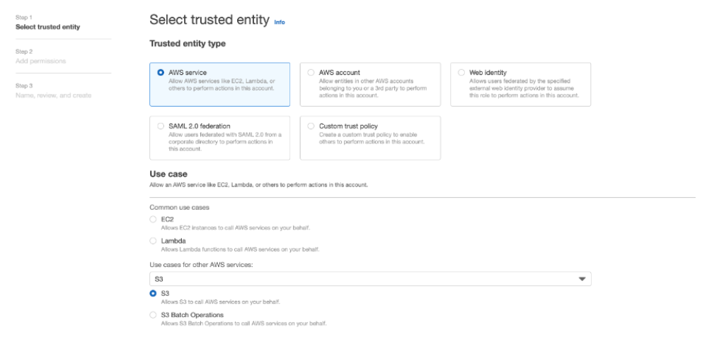 Make your selection based on account you would like to use and select S3 I as use case. Click next to policy. Select the policy you have created in above step.Go next window and click on Create role to finish role creation .